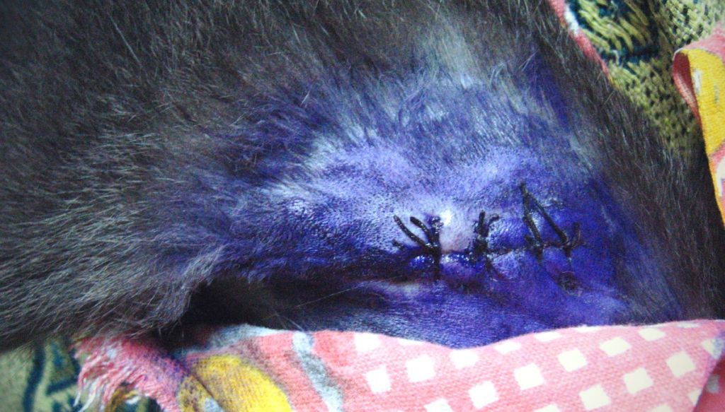 Шов после стерилизации суки (операционное поле обработано Алюминиум-спреем)