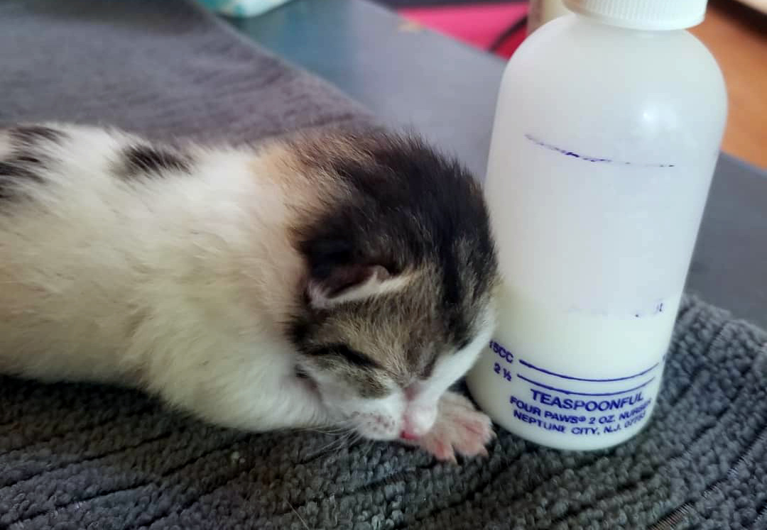 Котенка кормят, держа его вертикально, если он совсем мал, или лежа на животе. Категорически нельзя укладывать котенка на спину. Котята должны сами сосать бутылочку или носик шприца, заливать в них смесь недопустимо – она может попасть в дыхательные пути.