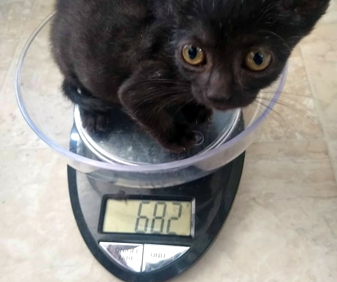 У этого котенка еще не открылись глаза. Взвешивание на кухонных весах