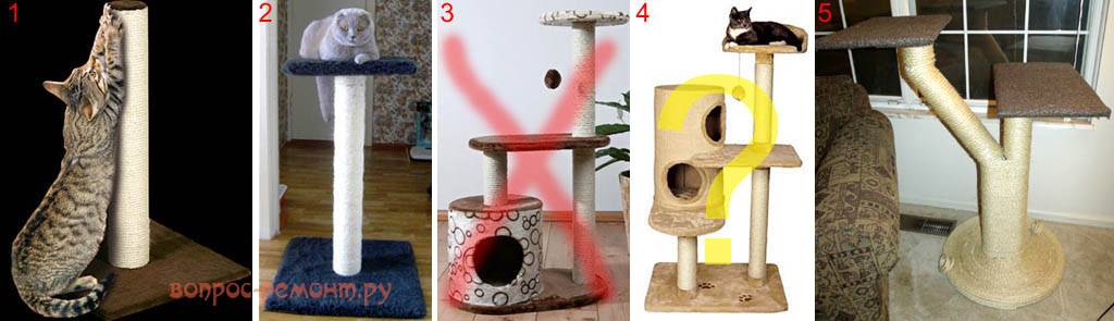 Данные когтеточки — самые популярные кошачьи изделия. Главное при выборе модели — подходящая животному высота столбика. Маленьким существам достаточно полуметра, взрослой кошке требуется от 70 или более сантиметров. Площадки с «колоннами» делятся по степени функциональности, а значит, сложности изготовления.