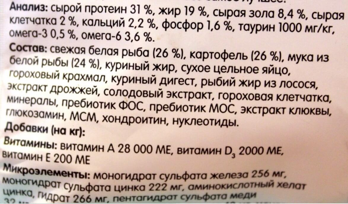 Основные составляющие его — белая свежая рыба (26%), порошок из белой рыбы (24%) и мука из цельного куриного яйца. Все 3 компонента — животного происхождения, и в этом большой плюс корма, поскольку животный белок усваивается кошачьим организмом лучше, чем растительный.