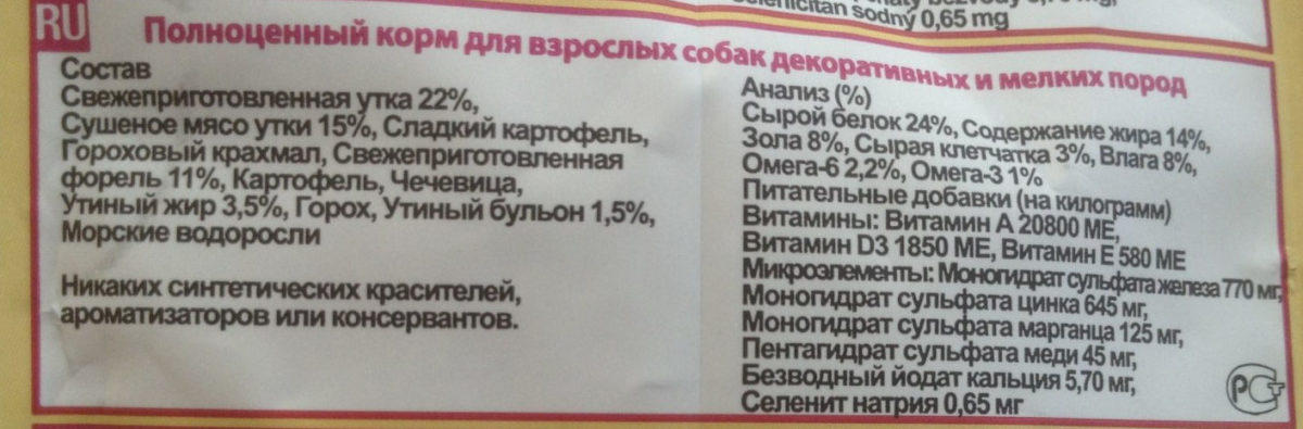 - Содержание основных ингредиентов, витаминов и минералов расписано подробно (в отличие от большинства кормов премиального класса).