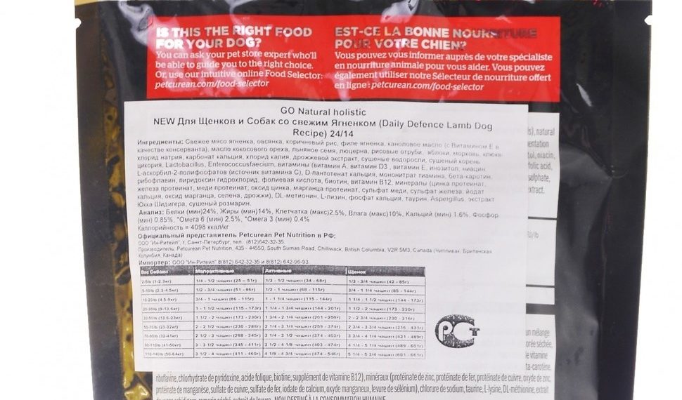 В корме GO Natural holistic для собак состав указанный на обратной упаковке только на иностранных языках, но по закону в таком случае должен клеится и перевод. На фото ниже — обратная сторона упаковки беззернового корма Гоу для щенков и собак с индейко для чувствительного пищеварения, правда наклеенный перевод не точный. В частности, касается это первого ингредиента — Turkey meal, то есть мука из индейки, а не свежее мясо индейки. К остальному претензий нет.