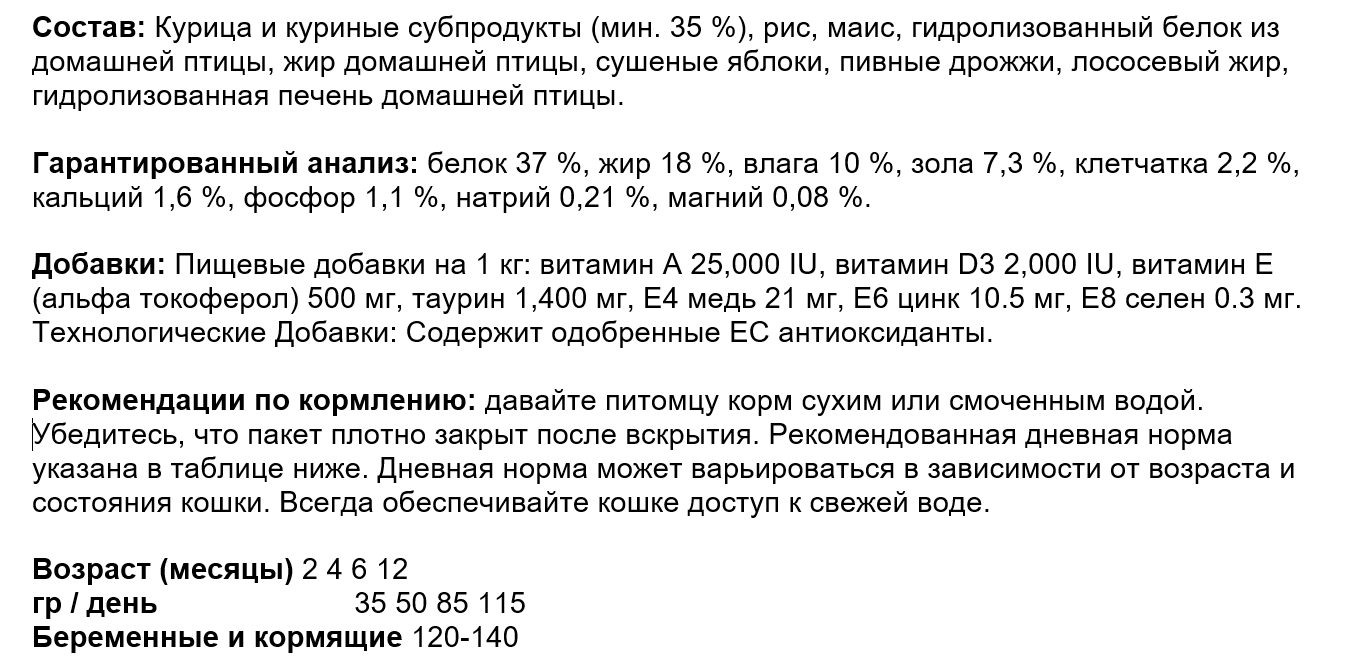Корм насыщен белком и жирами – 37 и 18%. Содержание клетчатки умеренное – 2,2%. По составу компонентов питание соответствует добротному премиум-классу.