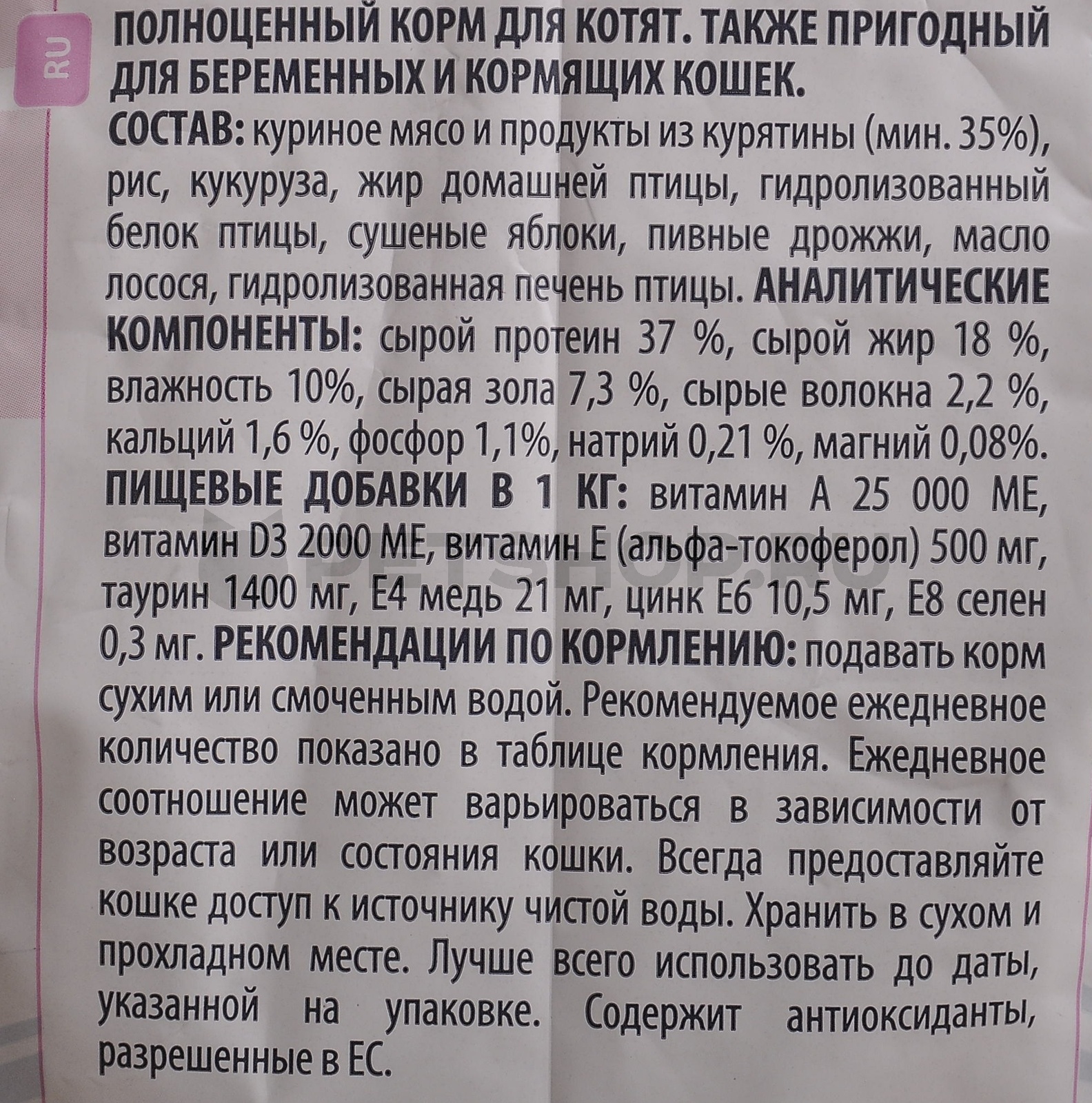 Очень хорошо, что производитель четко указывает, где просто курица, а где куриное мясо. Однако точный состав мясных субпродуктов нам неизвестен, лично я не вижу ни одного обозначенного субпродукта в составе. Это говорит о том, что изготовитель намеренно скрывает данную информацию, более того – сырье субпродуктов может меняться время от времени, и доподлинно установить его качество и пищевую ценность не предоставляется возможным.