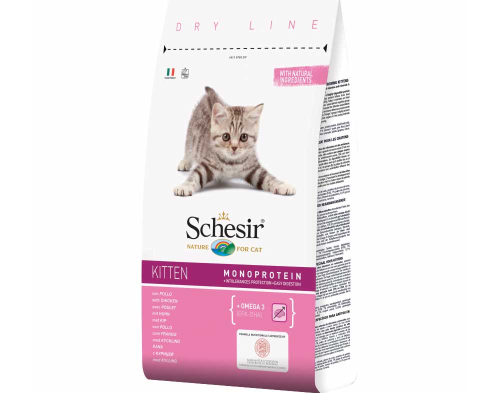 Главный источник животного протеина – курица. В корм добавлены витамины и аминокислоты в количествах, обеспечивающих рост молодняка в соответствии со стандартами породы. Специалисты рекомендуют применять питание для взрослых кошек с установленной беременностью, а также лактирующих. Использование Schesir Kitten позволяет избежать чрезмерного истощения кошки к моменту отъема.