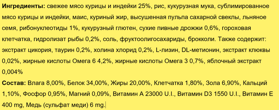 Для коррекции аминокислотного состава производитель включил в кормосмесь препараты лизина, метионина, таурина. Поэтому, по составу компонентов, продукт к суперпремиум-классу можно отнести с оговоркой. Однако по содержанию питательных веществ корм соответствует высокой оценке.