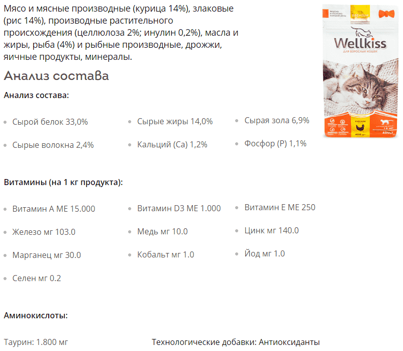 Пример состава корма Wellkiss для взрослых кошек с курицей