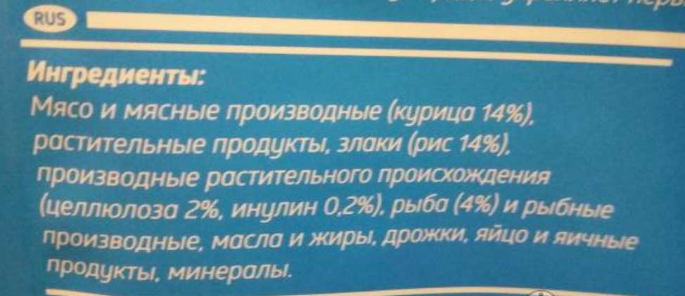 Непонятно, что такое производные растительного происхождения. Не исключено, что использовали соевый шрот, пшеничный либо кукурузный глютен. В дополнение к клетчатке растительных компонентов добавили очищенную целлюлозу. В кормосмесь включили 4 % рыбы и ее производные. В небольших количествах добавили дрожжи, а также яичный порошок. Кормосмесь насыщена жирами, но какими именно, производитель не сообщает. Включение таурина сглаживает недостатки корма.