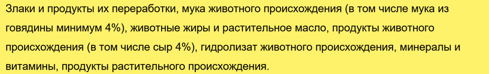 Остатки мясного производства включены под названиями «птичья мука», «мука животного происхождения», «мясные производные». Производителя заявляют, что их продукт содержит уникальную сбалансированную формулу углеводов, жиров и белков, ссылаясь на одобрение Международного центра питания животных и Российской ассоциации практикующих ветеринарных врачей.
