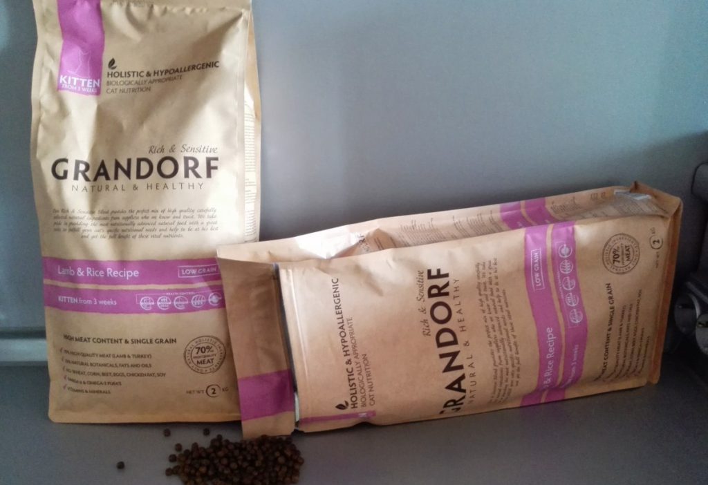 Grandorf Kitten. Котятам питание нужно особо питательное, с хорошим витаминно-минеральным комплексом для роста шерсти и укрепления костей. Линейка Grandorf Kitten содержит много мяса (70%), причем мяса диетического (специально для нежных желудков малышей): индейки и ягненка.