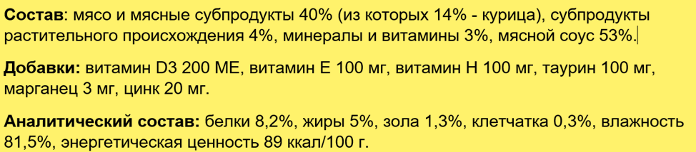 Один пакетик содержит 85 г корма, а калорийность составляет 80-84 ккал/100 г. В эту линейку входят корма: