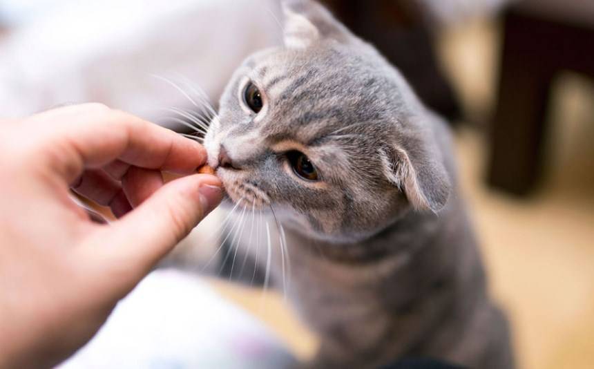 После нужно запастись кошачьим лакомством. Желательно использовать такое, которого нет в повседневном рационе животного. Это нужно для того, чтобы питомцу действительно хотелось его попробовать. Также желательно проводить тренировки спустя час и больше после приема пищи, чтобы кошка успел проголодаться.