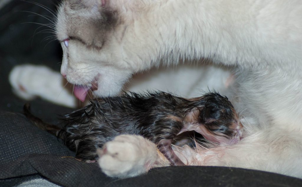 Котенок родился в пузыре, а кошка не обращает на него внимания – аккуратно вскрываем пузырь, убираем слизь изо рта и носа. Все процедуры проводятся на глазах кошки, чтобы она могла дотянуться до котенка и начать его вылизывать.