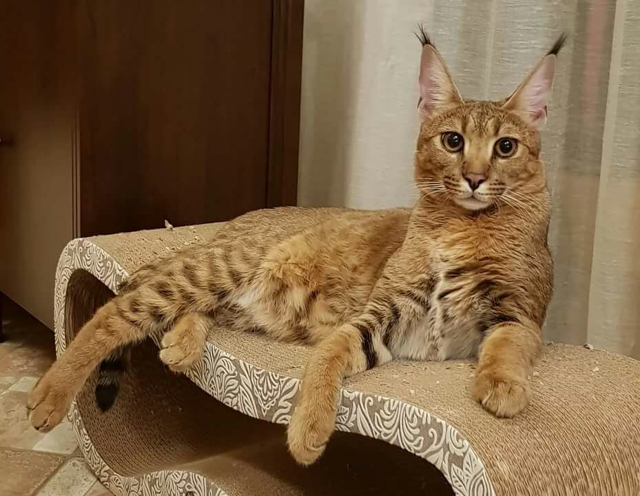 Редкая кошачья порода, похожая на рысь. Такой любимец идеально подходит для проживания с людьми, его можно дрессировать и выводить на прогулку на поводке.