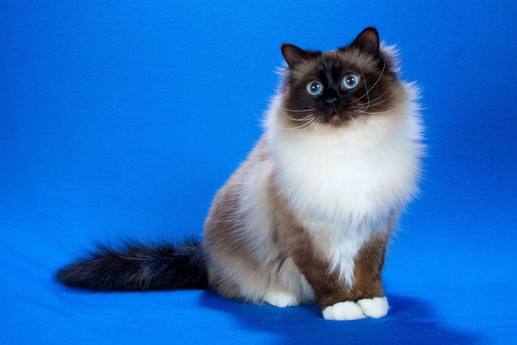 Бирманские кошки отличаются невероятной красотой – необычный окрас с белыми лапками, сапфирово-синие глаза. Классический окрас бирмы: цвет светлой части шерстки – светло-бежевый, темной – шоколадно-коричневый, однако, встречаются и другие типы окраса: