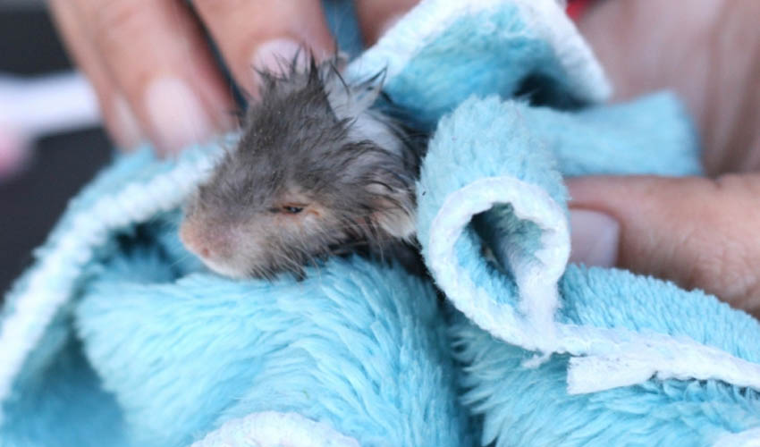 - Заверните хомяка в полотенце и просушите волосяной покров.