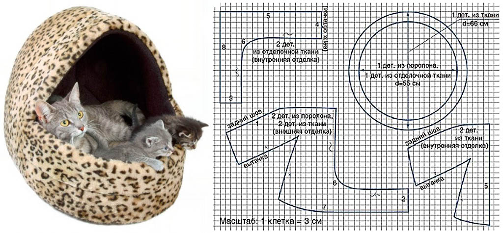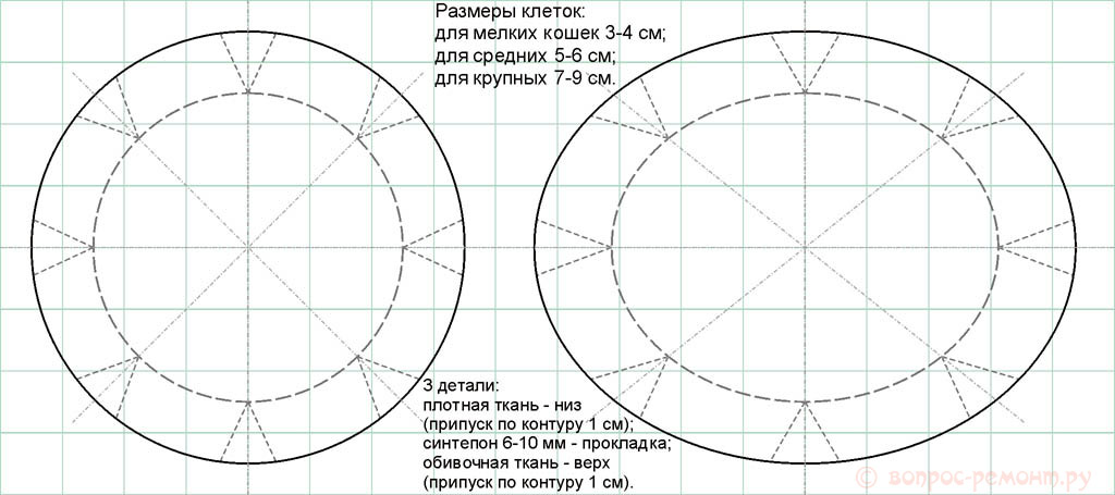 Выкройка круглой или овальной мягкой лежанки-блюдечка для кошки дана на рис. Круглая более подойдет любительницам спать, свернувшись калачиком, а овальная – коту-домоседу (напр., холощеному) или кошке с выводком.