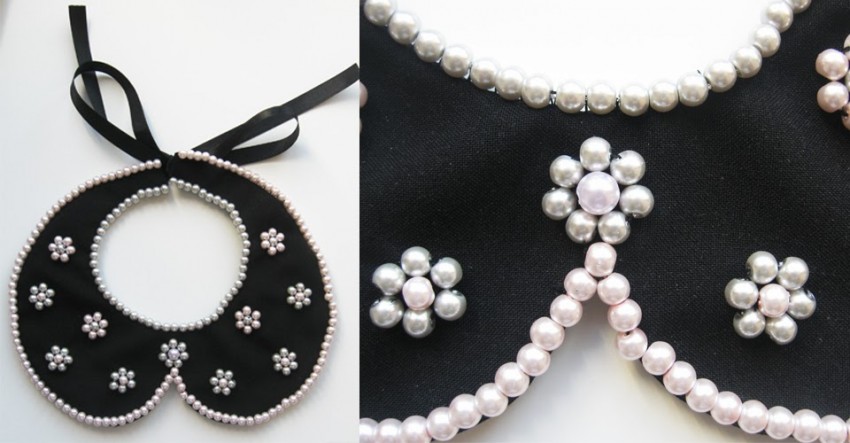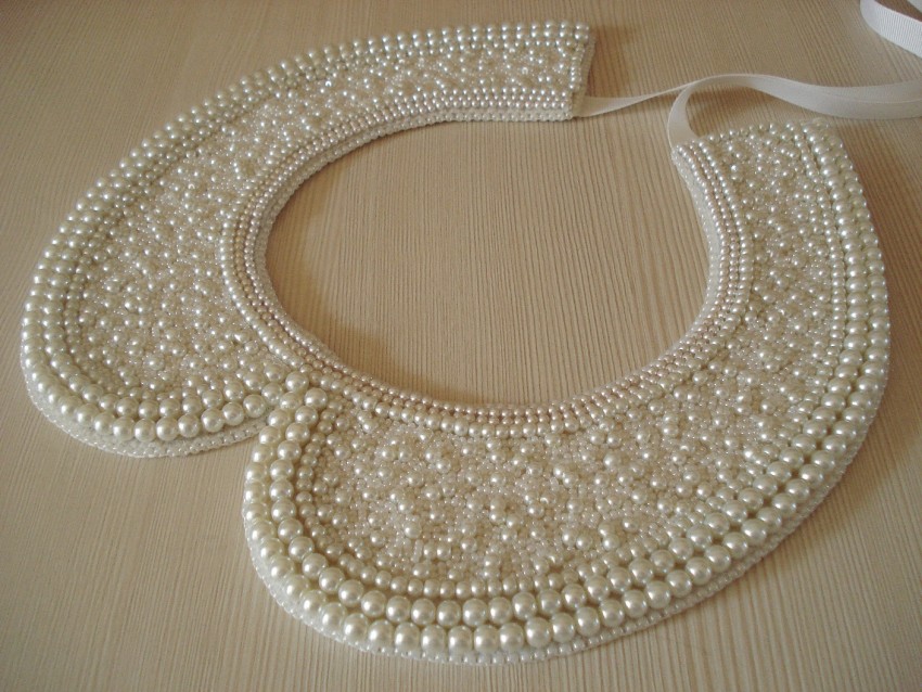 Когда основание воротника будет готово, можно переходить к украшениям. Рекомендуется брать жемчужные бусы и золотистые металлические палочки. Необходимо пришивать данные украшения с учетом рядов, чтобы узор получался одинаковым и ровным.