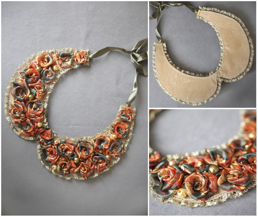 Фото сложных воротников ручной работы вы можете посмотреть в нашей статье. Для создания таких изделий потребуется масса времени, терпения и усидчивости, а также навыки шитья или хотя бы куча материала, на котором придется сперва потренироваться.