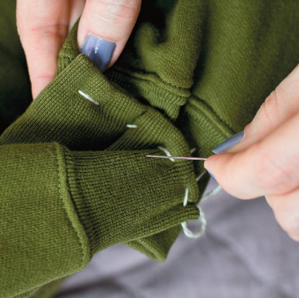 В первую очередь Необходимо зашить горло у свитера. Перед этим лучше вывернуть его наизнанку.