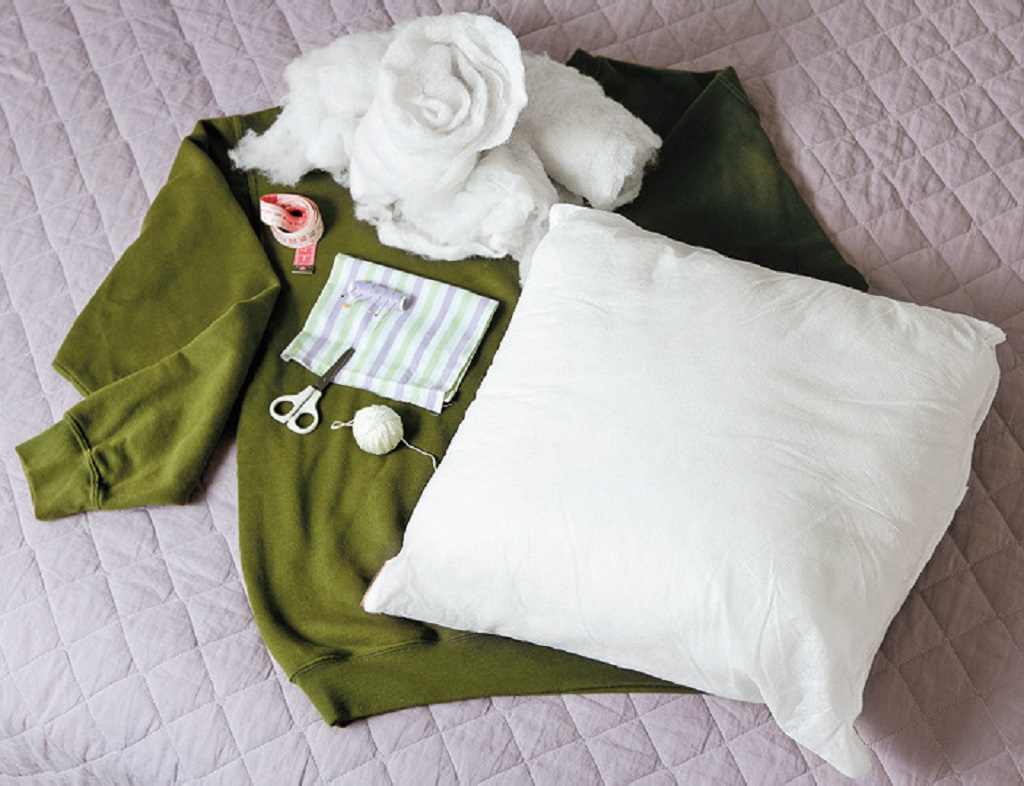 Приготовленную подушку или наполнитель помещают вовнутрь свитера, и низ зашивают. Эта часть будет служить дном