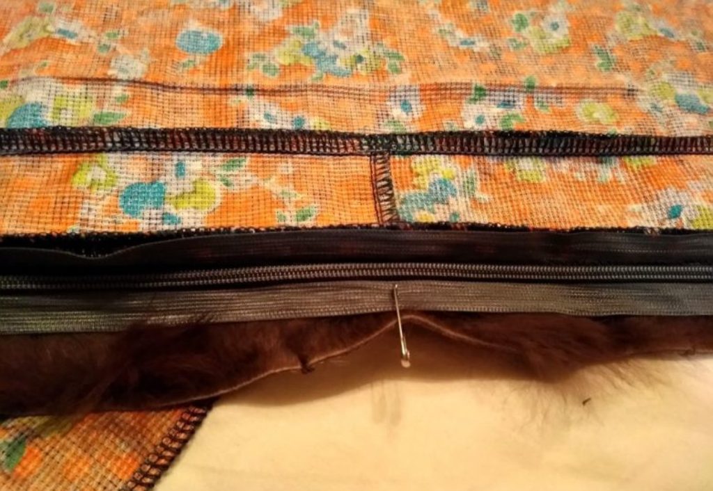 Между подкладкой и мехом положить наполнитель или старую подушку. Края зашить. Получится основа лежанки. Если подкладку использовать не удается, можно взять плотную ткань.