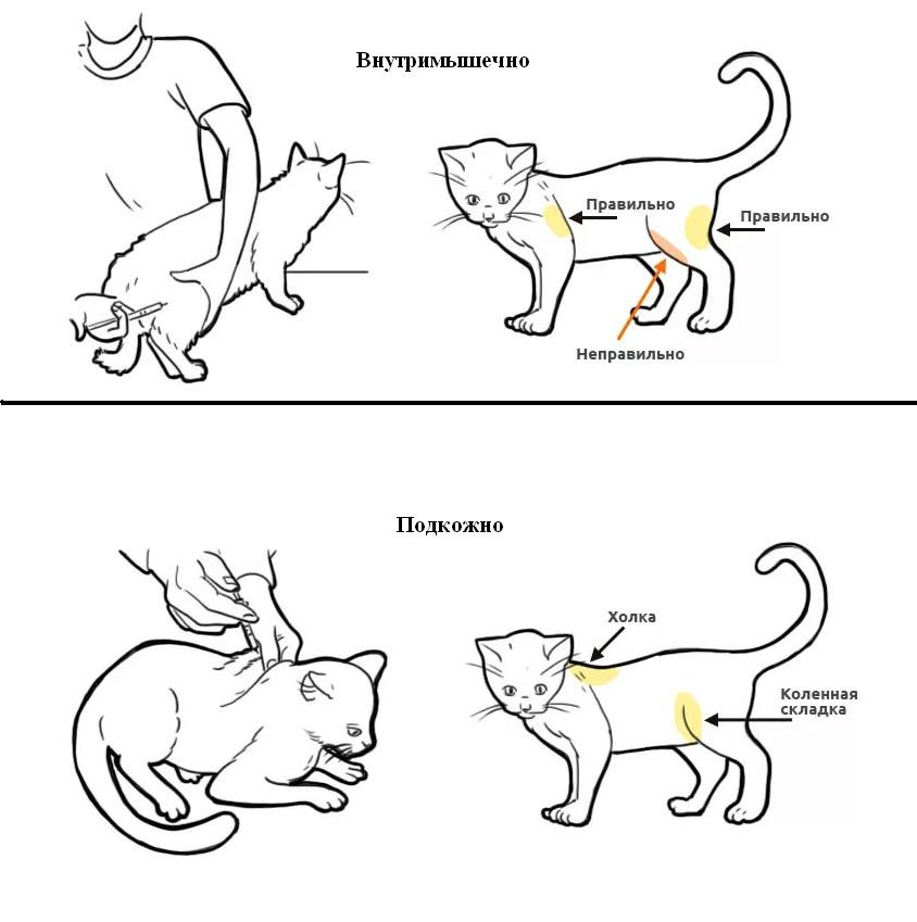 Для подкожного введения можно выбрать коленную складку, но чаще всего уколы делают в холку. Внутримышечную инъекцию удобнее всего делать в наружную часть бедра (самое широкое место).