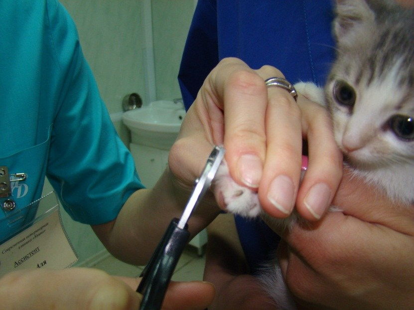 Подстригать коготочки питомца в одиночку затруднительно, поэтому позаботьтесь о наличии ассистента. Приготовьте щипцы для подрезания, средство для остановки крови, ватные диски. Они могут понадобиться вашему усатому другу, если вы заденете пульпу. Подстригание должно быть максимально безболезненным, быстрым, чтобы питомец не устал и не начал сопротивляться. Ассистент должен крепко держать кошку. Животное лучше поглаживать, отвлекая от неприятных переживаний.