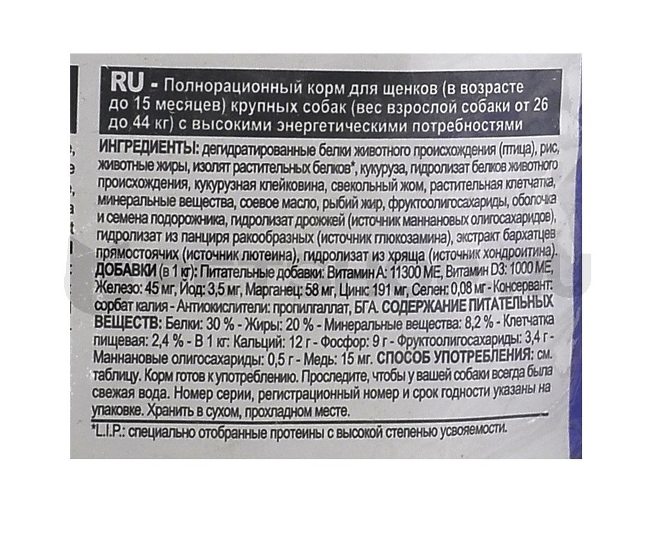 , как питание премиум-класса. Это значит, что покупатель должен увидеть в составе корма на первых позициях мясо, то есть белковую составляющую, далее следуют углеводы, жиры, пребиотики, витамины и микроэлементы. Многих владельцев собак огорчает факт, что белки занимают третье место, а также не указано процентное соотношение содержащихся веществ. Корм перенасыщен дешевой кукурузой и непонятными составляющими.