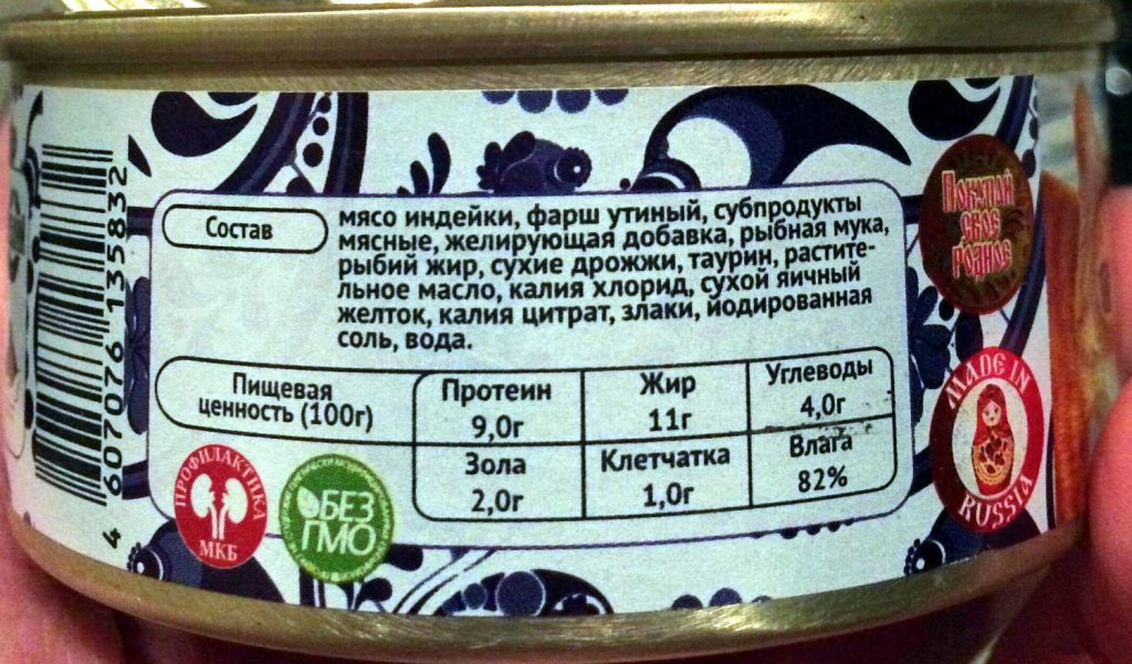 Основа корма — мясо куриное и телятина, эти два ингредиента находятся на первом и втором месте соответственно. Мясо является хорошим источником белка, которого в составе не менее 11,5% (указано в пункте «Пищевая ценность»).