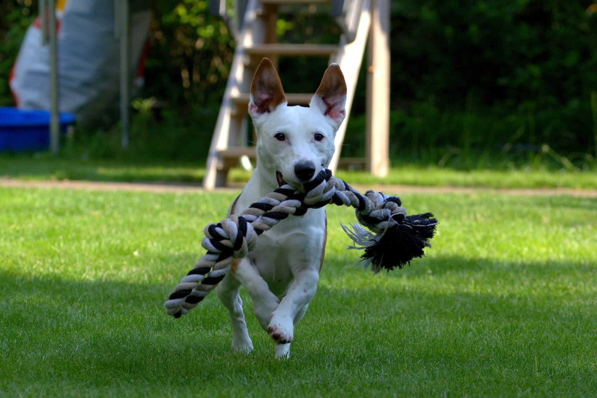 - игрушка канат. Для собак — это прекрасный тренажер челюсти. Как правило, изделия делаются из веревки, на концах закрепляются ухваты из резины либо пластика. Но играть в перетягивание можно лишь тогда, когда у песика формируется прикус;