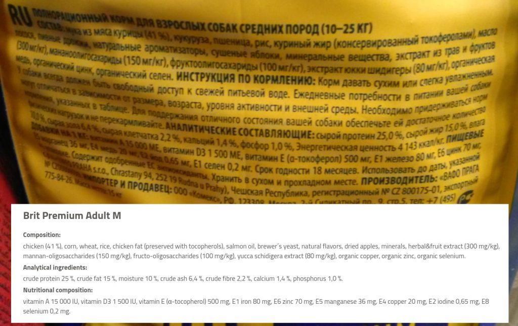 - Корм для взрослых собак содержит мясо не менее 50%, при этом количество белка 21-26%, жира 9-15%, клетчатка до 4%.