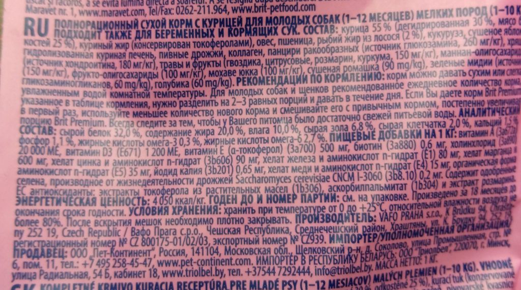 Корм подходит малышам с 4-месячного возраста до года. Он сделан на основе курицы и риса, содержит повышенное количество белкового компонента (42%), жирные аминокислоты и сушеные яблоки, как источник витаминов. Его цена составляет в среднем 550-650 рублей за упаковку весом в 3 кг.