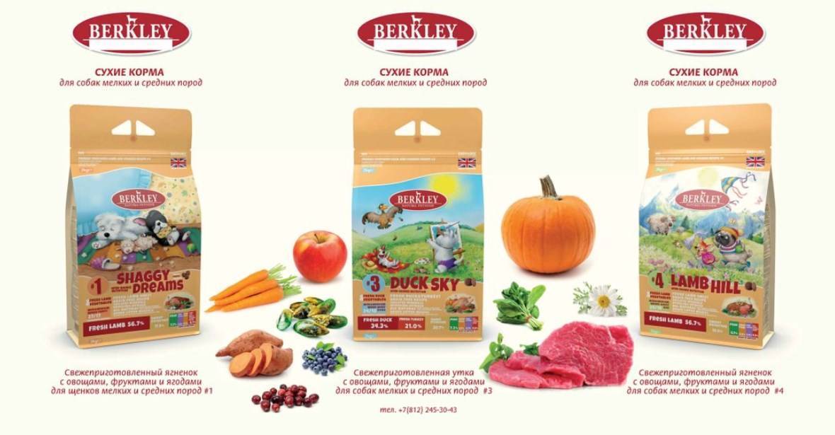 Собачий корм Berkley – универсальный, потому что включает линейки для взрослых собак и щенков, также есть отдельные варианты для аллергиков или для лечения ожирения.
