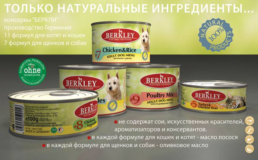 Важно, что все линейки и варианты влажных консервов в Berkley направлены на профилактику и лечение ряда заболеваний, как чувствительное пищеварение, аллергия, дерматит, запор, почечная и сердечная недостаточность, ожирение, болезни двигательного аппарата