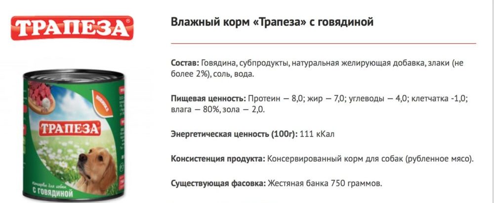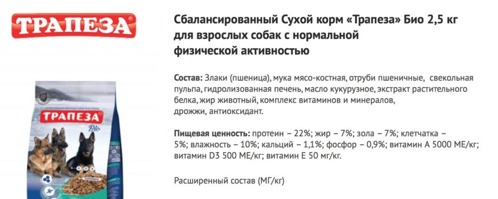 - В целом, состав кормов Трапеза можно описать как скудный, однако содержание белков (22-28%), жиров (7-15%) и клетчатки (около 5%) в норме. Включение полезных элементов, заявление производителя о натуральности всех ингредиентов и отсутствие всевозможных добавок в корма – неоспоримые достоинства этих экономичных рационов.