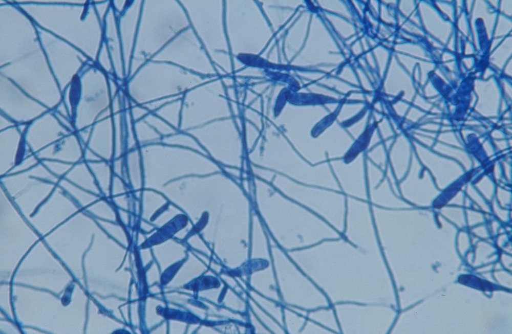 На фото представлен возбудитель дерматомикоза, увеличенный под микроскопом.