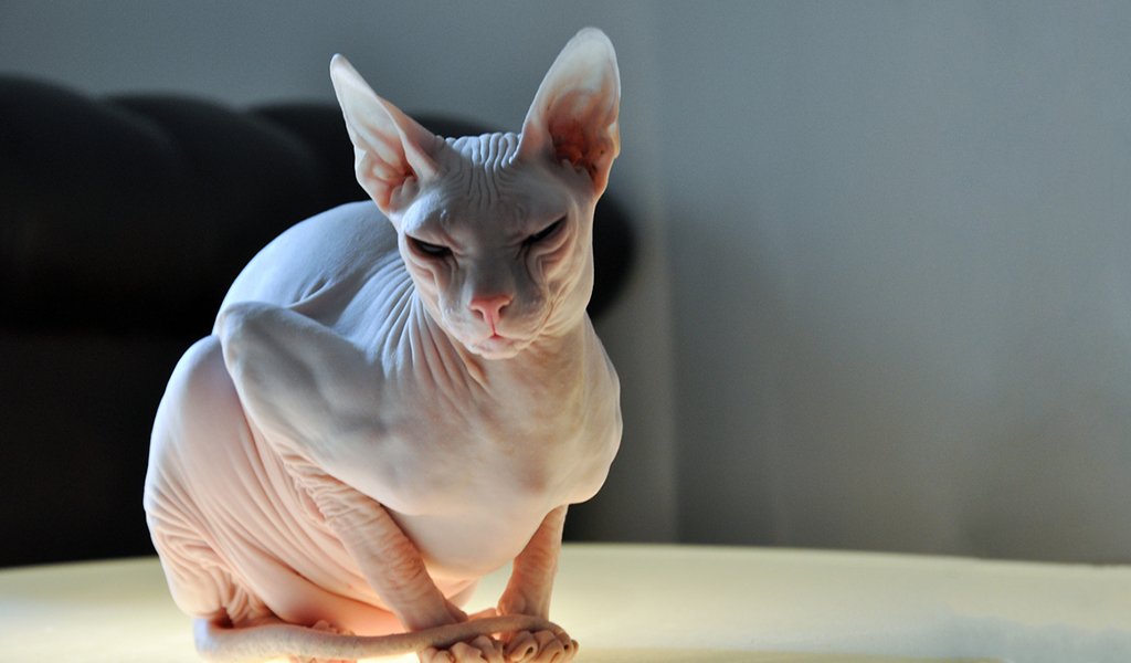 Хотя сфинксы кажутся абсолютно голыми, на самом деле это не так. На теле кошек есть тонкие волоски длиной не более 2 мм. Короткая и редкая шерсть присутствует на наружной стороне ушных раковин, на нижней части живота, между пальцами и на хвосте.