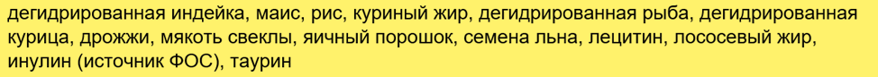 Стандартный для кормов премиум-класса и выше состав включает обезвоженную индейку, рыбу и курицу, яичный порошок. Каково качество исходного сырья, содержание мяса, каков процент субпродуктов – неизвестно. Однако радует отсутствие в рецептуре несбалансированных растительных белков.