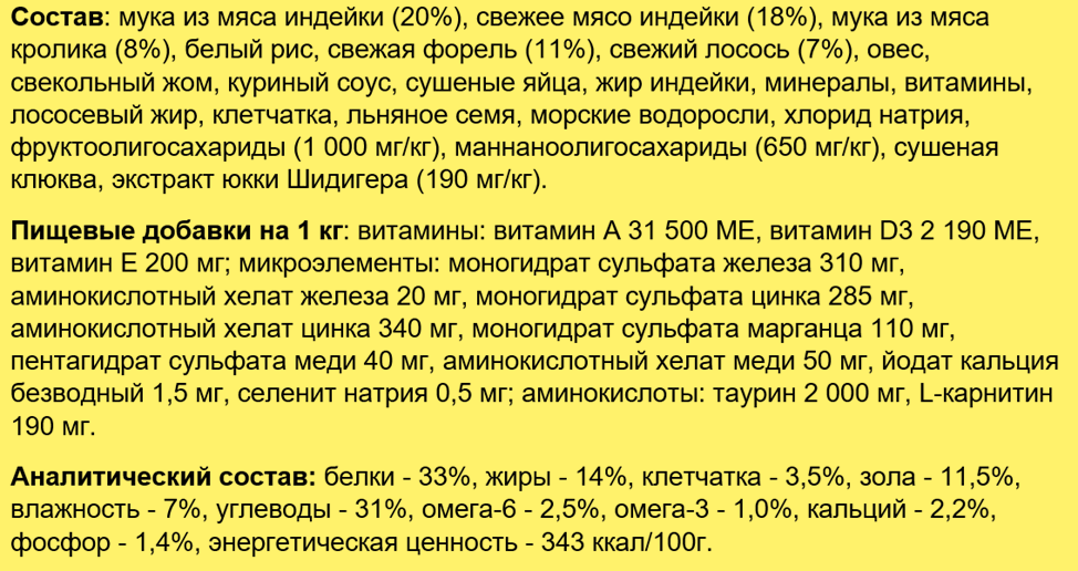 Кроме риса и сушёного мяса индейки, в основу продукта включено лососёвое масло. В первую пятёрку также попал источник МОС — пивные дрожжи, но в данной ситуации, хотя и очевидно, что это добавка, мы их исключить из подсчёта баллов корма не можем.