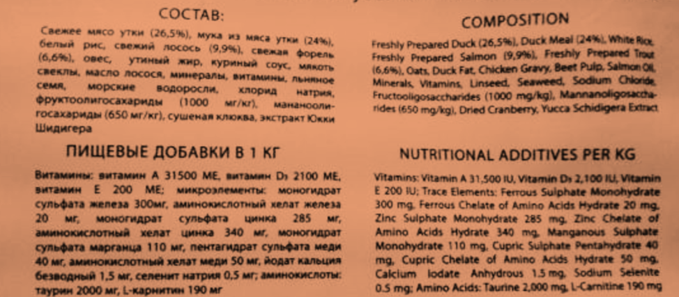 Под первым номером здесь 28% курицы, имеется в виду свежее мясо, которое в процессе приготовления утратит воду, а значит, этот показатель в готовом корме значительно снизится. Из этого можно смело делать выводы, что красноречивое заявление производителя представляет собой не что иное, как рекламный ход. Та же участь постигнет и форель с лососем, в итоге и без того небольшое количество окажется вообще несущественным.