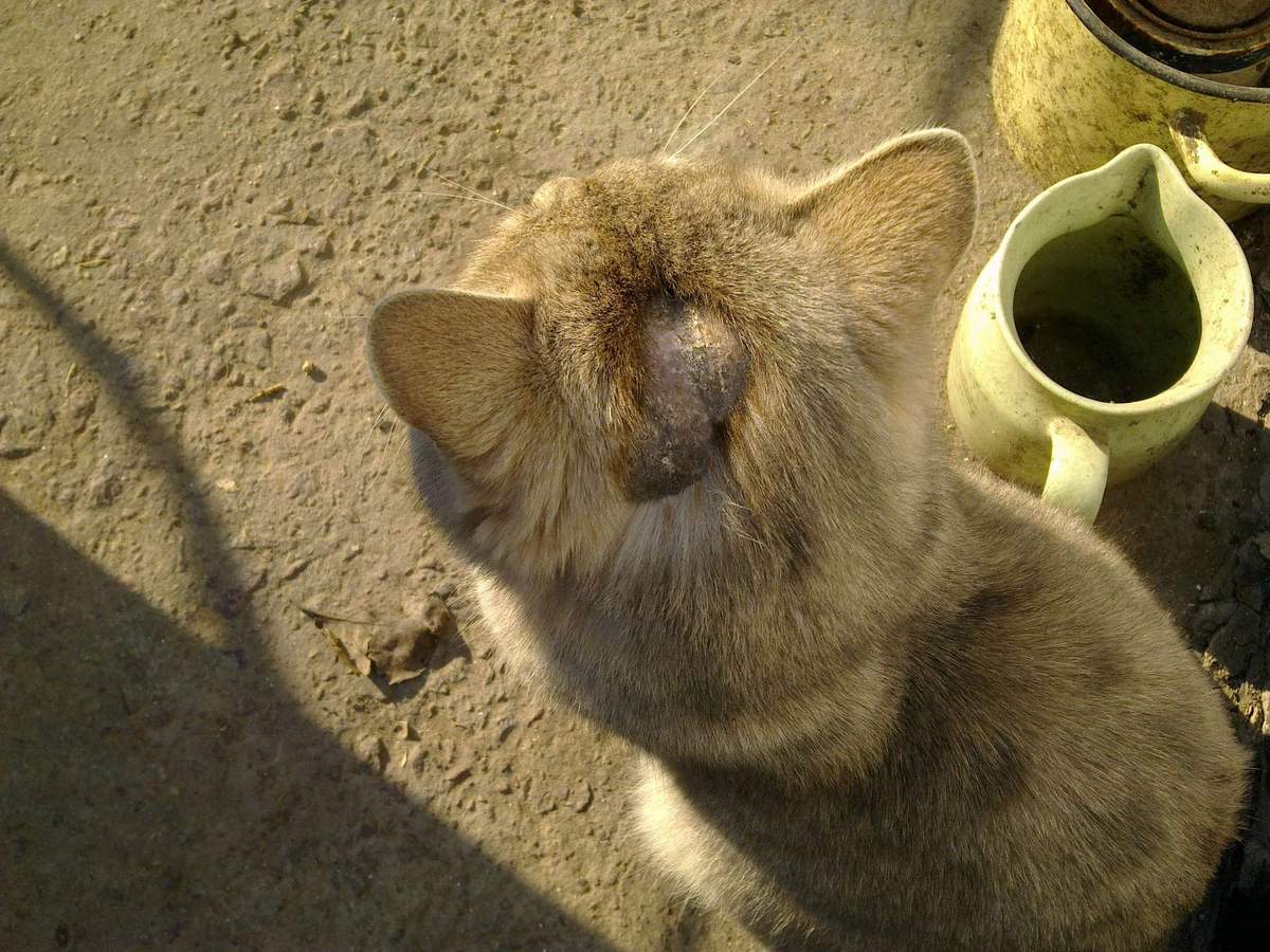 - На коже присутствуют открытые ранки с обожженным краем. Спустя непродолжительный период времени начинается некроз тканей. Состояние сопровождается сильной болью, высокой температурой, общей интоксикацией организма. Кот плохо себя чувствует и может потерять сознание.