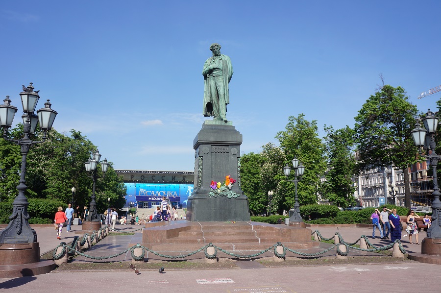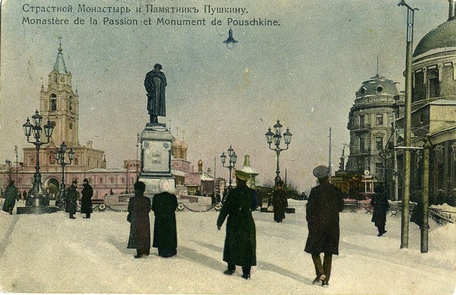 Пожалуй, самый известный памятник Москвы — памятник Пушкину работы скульптора Александра Опекушина. Он был задуман в честь восьмидесятилетнего юбилея поэта, но открыт годом позже, 6 июня 1880 г., в день, когда Пушкину исполнился бы 81 год. В отличие от многих известных литераторов и живописцев, Пушкин при жизни ни разу не позировал для создания своих скульптур. Изначально монумент стоял на противоположной стороне Тверской улицы, спиной к Тверскому бульвару, и смотрел на Страстной монастырь.