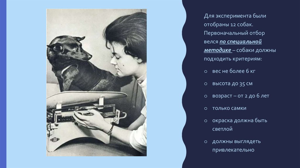 Главе конструкторского бюро С.П. Королеву требовалось отобрать для полета 12 собак, отвечающих следующим требованиям: рост в холке не выше 35 см, вес не более 6 кг, возраст от 2 до 6 лет. Окрас собак должен быть светлым – так за ними будет проще наблюдать на тогда еще черно-белых мониторах. Примечательно, что кобелей в качестве космонавтов не рассматривали, так как для них гораздо труднее было разработать ассенизационное приспособление, утилизирующее естественные отходы жизнедеятельности.