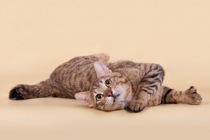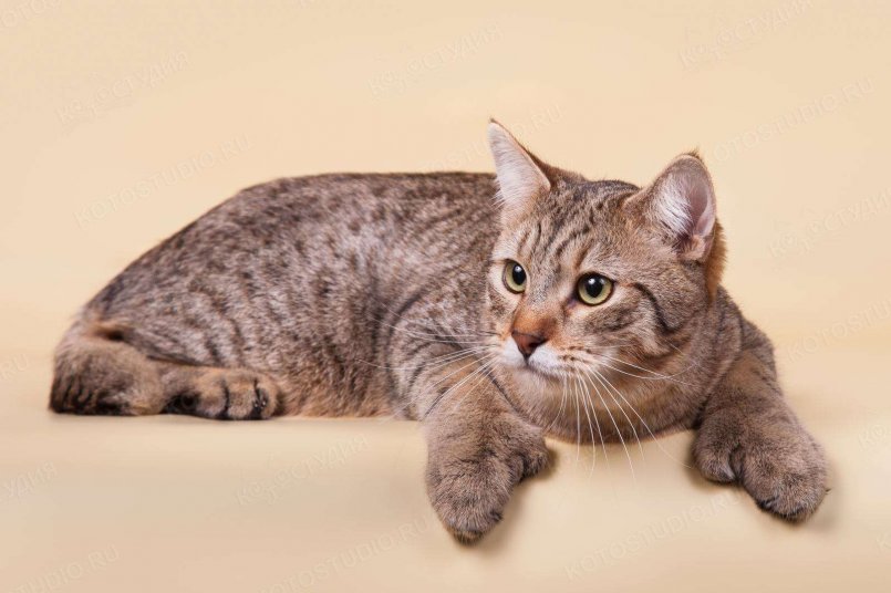 - окрас — только коричневый пятнистый тэбби, шерсть с лёгким сероватым оттенком, фон тикированный, на животе и подбородке шерсть высветлена, подушечки лап, ступни и кончик хвоста тёмно-коричневые или чёрные, а вокруг глаз светлые «очки»,