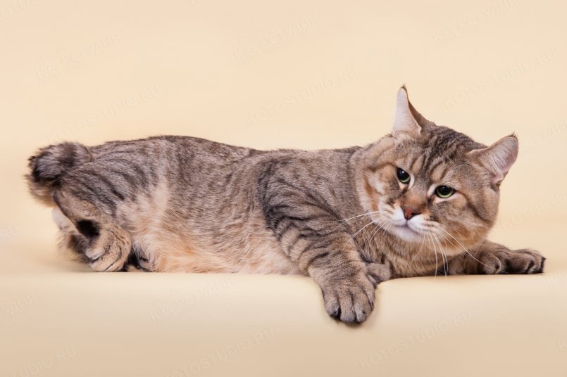 - хвост кошки имеют функциональный и подвижный, однако, его длина, являясь породообразующим признаком, не доходит до скакательного сустава. Минимальный размер – порядка 5 см. При этом стандарты породы отдельно настаивают на изгибах и узлах;