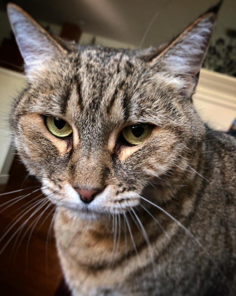 - подушечки вибриссов мягкие, массивные и округлые, вибриссы растут опущенными, придавая мордочке кошки немного грустный вид,
