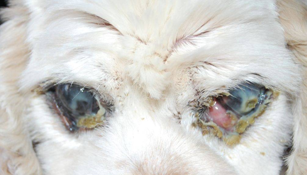 Симптомы: у животного слезятся и краснеют глаза, учащается моргание, нарушается целостность роговицы, появляются язвочки, гноение, частичная слепота, выпадает третье века.
