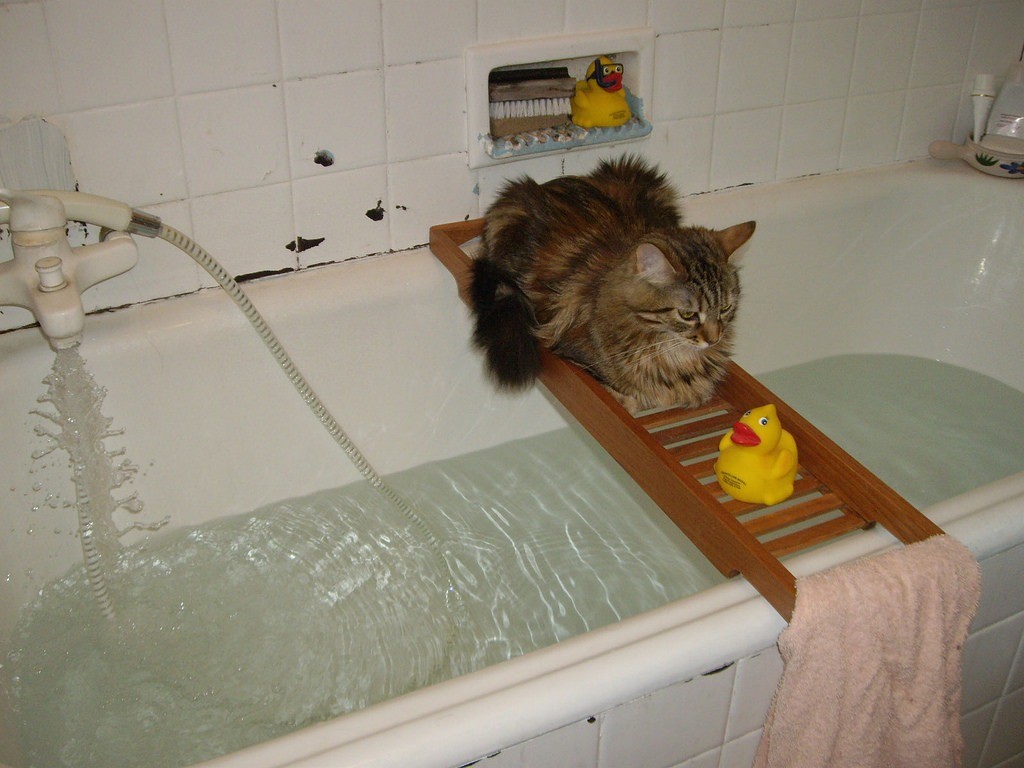 - также рекомендуется позаботиться о предоставлении коту возможности быстро покинуть ванну по собственному желанию, например, опустив туда ступеньки — так кот не будет чувствовать себя в ловушке и станет более уверенным и позитивным.